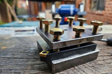 The X-Y table is aligned with and bolted to the ways using two fabricated tee-nuts. The homemade 4-way tool holder also uses fabricated tee-nuts so that it can be fixed to the table’s tee-slots.