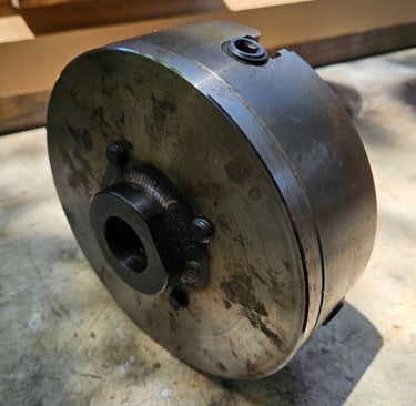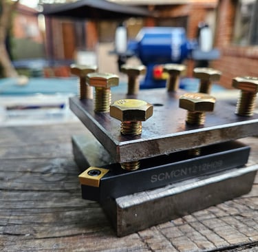 My thoughts were, I bet I could mount that long-held four-jaw chuck, purchase a $240 eBay X-Y table to bolt onto that cast iron bed, and as my first real project, fabricate a 4-way tool holder. I did that, and it all worked amazingly well. I actually turned the backing plate to mount the four-jaw chuck onto the wood lathe spindle using that setup. I then mounted the chuck and proceeded to turn a few more pieces of steel and aluminium for fun.